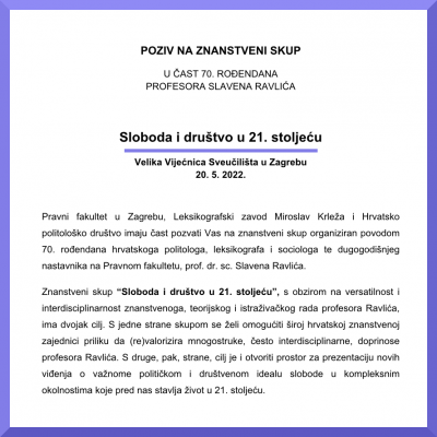 Hrvatsko politološko društvo vas poziva na znanstveni skup "Sloboda i društvo u 21. stoljeću", povodom 70. rođendana hrvatskoga politologa, leksikografa i sociologa Slavena Ravlića. Skup će se održati 20. svibnja 2022. u Velikoj Vijećnici Sveučilišta u Zagrebu. Program skupa se nalazi u privitku.